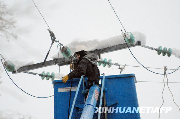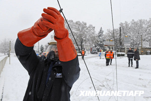 12月14日,一名電力工人在法國中部城市布拉薩克萊米訥搶修供電設備。新華社/法新