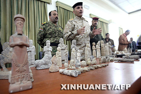 12月16日,伊拉克軍人在南部城市巴士拉展示找回的部分珍貴文物。自從2003年美國發動伊拉克戰爭以來,伊拉克境內約有1.5萬件文物失竊,許多文物流入國外的藝術品拍賣市場。伊政府目前已找回約8500多件失竊文物。 新華社/法新