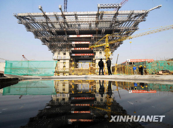 12月17日拍攝的上海世博會中國國家館施工現場。12月17日是上海世博會倒計時500天。世博會中國國家館目前已雄姿初現,中國國家館和地區館將于12月底實現“雙封頂”。新華社發