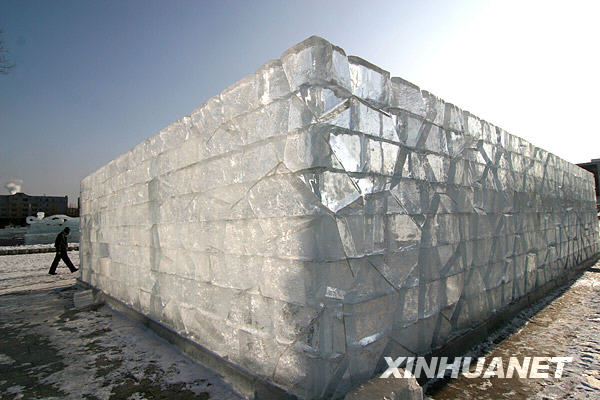 12月21日在吉林省吉林市世紀廣場拍攝的冰燈游園會門樓。吉林市冰燈游園會將于12月23日開幕,目前園內“水立方”、“神七”等大型冰燈作品已完工,工人們正在進行收尾工作。