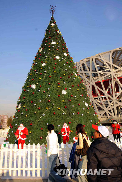 12月23日,游客在國家體育場(“鳥巢”)前參觀大圣誕樹。當日,一棵高24米,底盤直徑為12米的圣誕樹在國家體育場(“鳥巢”)前布置完成。除了這棵大型圣誕樹外,奧林匹克公園內還搭建了110棵5米高的圣誕樹。這些圣誕樹與圣誕木屋以及各種彩燈和裝飾掛件把奧林匹克公園裝扮得格外美麗。