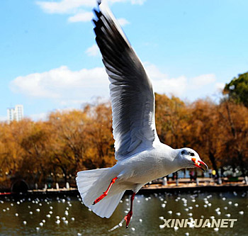 12月23日,一只紅嘴鷗爭得食物后在翠湖公園中飛翔。近日,據昆明市林業局統計,由于昆明市生態環境不斷改善,2008年冬季到昆明越冬的紅嘴鷗數量達31700余只,同比增加700余只。