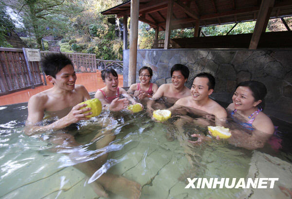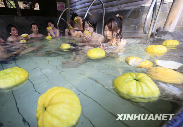 12月24日,游客在日本東京西南的溫泉之鄉——箱根體驗“柚子溫泉”。新年將至,位于箱根的一家溫泉度假村將附近出產的新鮮柚子加入湯池中。經營者稱這樣能使溫泉具有舒筋活血的功效。在日語里,“柚子”的發音和“融通”相近,泡柚子溫泉,寓意得融通之效。
