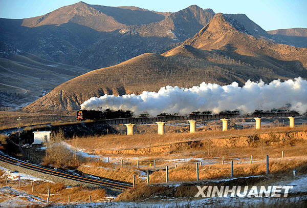 12月27日,“集通號”草原旅游蒸汽火車駛過內蒙古克什克騰旗經棚—嘎拉德斯太段的司明義特大橋。當日,由內蒙古集通鐵路集團與克什克騰旗共同舉辦的第二屆蒸汽機車旅游節在經棚火車站拉開帷幕。在為期7天的旅游節上,主辦方將為來自國內外的萬余名旅游者、攝影師舉辦蒸汽機拍攝、乘坐“紅色專列”及鐵路沿線采風活動。