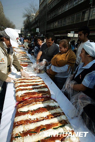 1月4日,市民在墨西哥城舉行的制作面包活動上等待工作人員分發面包。 當日,墨西哥國家面包工業商會在墨西哥城的11月20日大街舉行制作大面包活動。制作的面包長1600多米,重達1萬多公斤。制作這個大面包消耗了6600公斤面粉,3000公斤奶油,44000個雞蛋,1500升牛奶,2000公斤食糖等。共有2300人從4日凌晨3點開始制作,直到6點結束,耗資100萬比索(1美元約合13比索)。