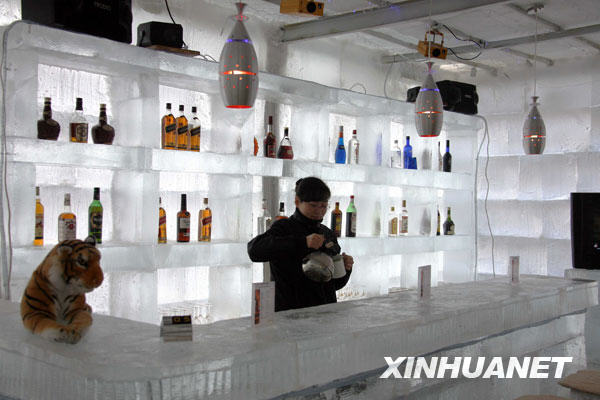 1月6日拍攝的富有東北民俗風情的“冰酒吧”走廊。近日,一個主要用冰塊建成的“冰酒吧”亮相哈爾濱!氨瓢伞眱鹊陌膳_、桌椅等全部由冰制成,用冰量達700余立方米,并用東北民俗風格進行裝飾。