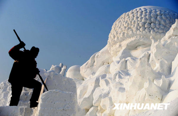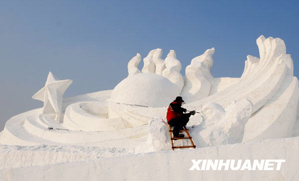 1月6日,一名工人在巨型雪雕旁進行收尾工作。
