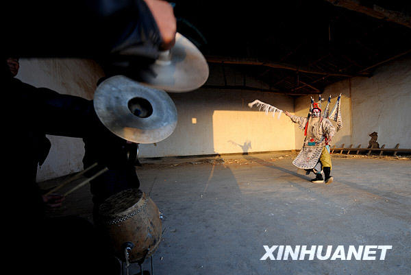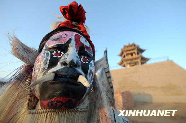 1月7日,高臺縣羅城鄉紅山村村民、48歲的藺耀宗在進行秦腔獠牙特技表演。