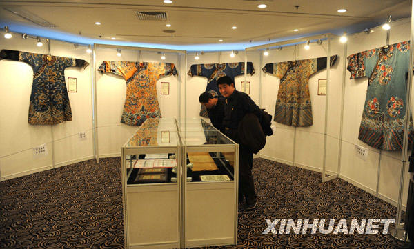 1月14日,來賓在預展上觀賞拍品。當日,北京北緯四十度大成國際拍賣公司(北緯拍賣)在北京舉行新聞發布會暨拍品預展,宣布包括30件清宮龍袍在內的40件珍貴宮廷藝術精品將在1月16日舉行的北緯首拍會上進行拍賣。