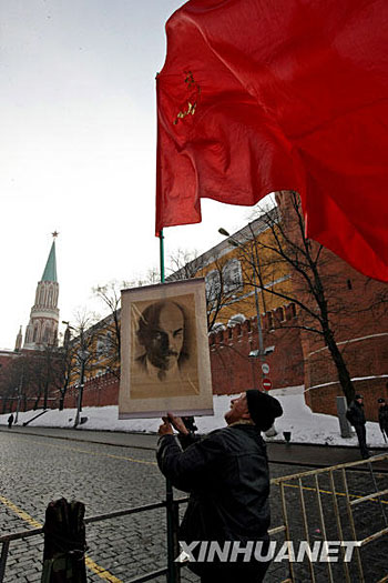 1月21日,在俄羅斯首都莫斯科紅場附近,一名俄共老黨員高舉掛有列寧像的紅旗。當日,數百名俄共黨員及普通民眾舉行活動,紀念列寧逝世85周年。1921年1月21日,無產階級革命的偉大導師列寧在莫斯科附近的哥爾克村逝世,享年54歲。