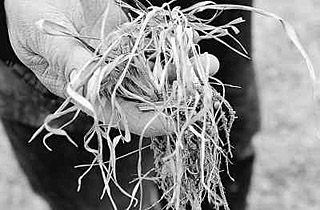| 2月1日,河南省中牟縣白沙鎮崗李村農民查看嚴重干旱的麥苗。新華社記者