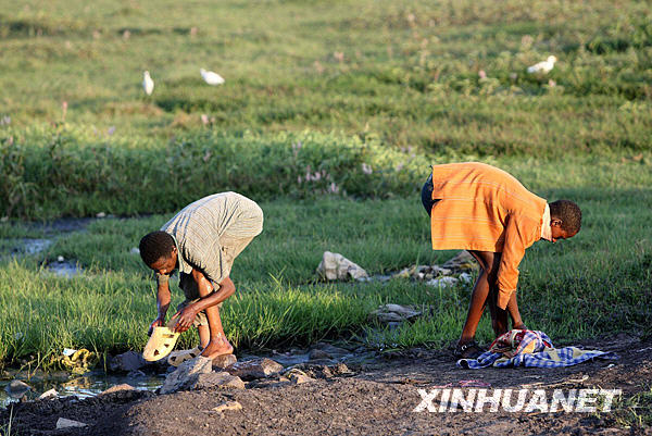 2月3日,在埃塞俄比亞首都亞的斯亞貝巴郊區,一名男子在一條水溝旁洗鞋,而他的同伴用同樣的水洗臉。供水設施的匱乏使得當地一些居民不得不每日去住所附近的水井或小溪背水。隨著非洲大陸總體政治局勢趨于穩定,許多非洲國家都將基礎設施建設作為振興經濟的優先發展方向,“非洲基礎設施建設”也是目前正召開的第12屆非洲聯盟(非盟)首腦會議的主題。