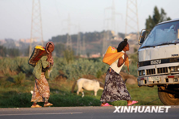 2月3日,在埃塞俄比亞首都亞的斯亞貝巴郊區,兩名婦女背水過馬路。