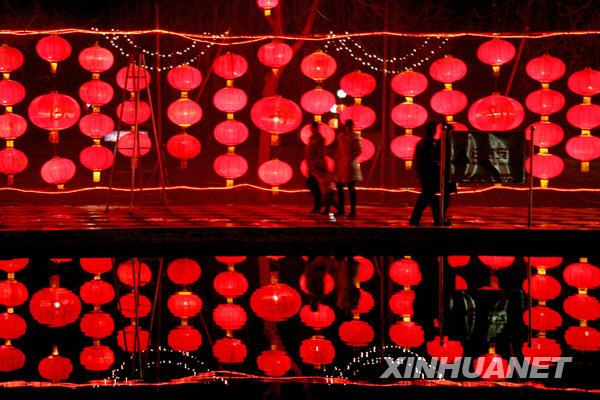 2月2日,永濟市民在櫻花公園觀賞“紅燈墻”。近日,山西省永濟市櫻花公園用紅燈籠組成“紅燈墻”、“紅燈走廊”等藝術燈組,迎接元宵佳節的到來。
