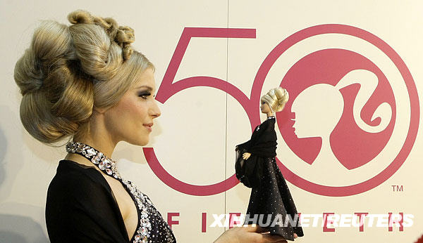 2月4日,在德國紐倫堡,一名模特手持與其衣飾相似的芭比娃娃出席芭比娃娃新品發布會,慶祝風靡全球的芭比娃娃面世50周年。新華社/路透