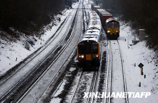 2月3日,在英國漢普郡,一列客車在布滿積雪的鐵道上行駛。英國行業協會當日公布的一份調查數據顯示,大雪給英國造成的經濟損失可能超過10億美元。如果降雪持續,這一數字可能繼續上升,使本已陷入衰退的英國經濟雪上加霜。新華社/法新