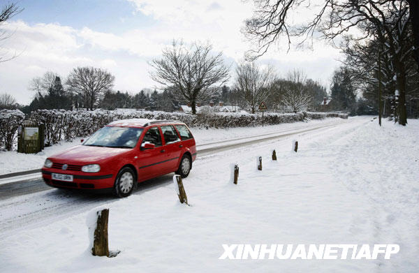 2月3日,在英國漢普郡,一輛轎車在布滿積雪的道路上行駛。新華社/法新