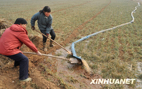2月4日,村民引來洛河水灌溉農田。由于2008年10月以來一直缺少有效降水,河南大部分地區出現不同程度的旱情。其中僅洛陽市高新區辛店鎮辛店村小麥受旱面積就達1000多畝,目前全村正動員干部群眾進行農田灌溉,現已有三分之一的受旱農田完成灌溉。