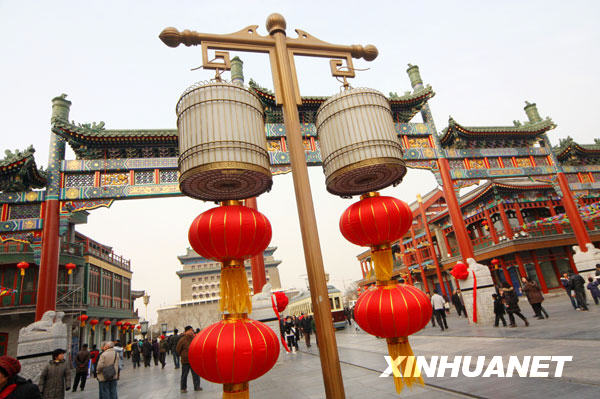 北京前門大街鳥籠造型的路燈上懸掛了大紅燈籠,喜迎元宵佳節(2月8日攝)。