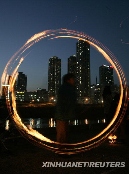 2月8日,在韓國首都首爾,一名男孩玩起轉火罐的游戲,慶祝農歷新年第一個滿月。韓國民眾有慶祝農歷新年第一個滿月的傳統,人們點燃火罐、木柴堆,祈求新年平安、豐收和幸福。新華社/路透