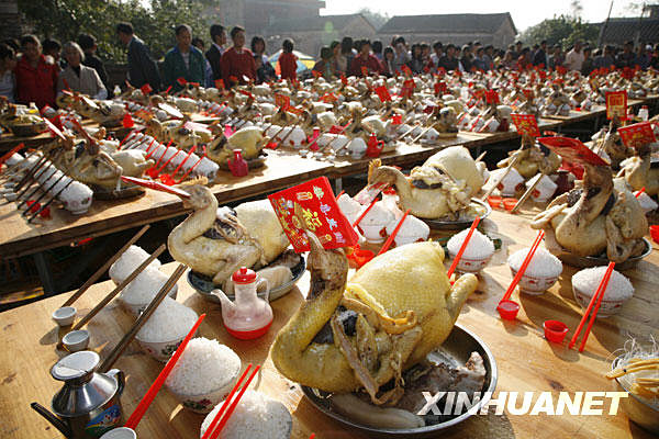 2月8日,廣東湛江廉江市營仔鎮云峽村的村民們在煮好的雞嘴里夾上“紅包”后集中擺放在村中祠堂前的宴席上。 當日是農歷正月十四,是廣東湛江廉江市營仔鎮云峽村的傳統“年例”,當地老百姓依習俗殺雞設宴,祭祀社稷,祈禱風調雨順,五谷豐登。