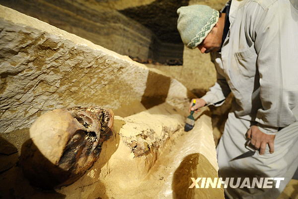 2月11日,在埃及開羅以南的塞加拉地區的墓地中,工作人員清理一具木乃伊身上的塵土。當日,埃及最高文物委員會主席扎!す咚乖谶@個墓地中打開了一具新發現的古埃及石棺,并從中找到一具保存完好的木乃伊。埃及考古學家此前在這個位于塞加拉地區著名的階梯金字塔西南的墓地中發現了木乃伊、木棺和石棺等文物共30件,這些文物的歷史可追溯到2600年前。