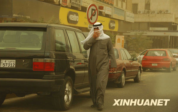 2月11日,在科威特街頭,一男子用頭巾捂住口鼻遮擋風沙。2月11日,科威特遭遇今年以來的最強沙塵天氣,天空變成灰蒙蒙的一片,沙漠地區能見度降低到幾十米。