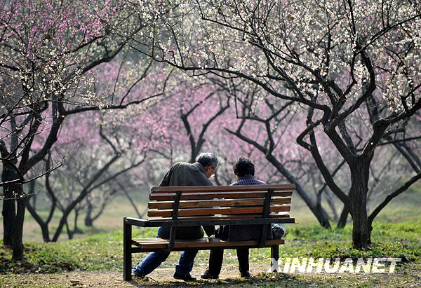 2月9日,兩位老年人在武漢東湖梅園中的長椅上休息。占地800多畝的武漢東湖梅園擁有梅花品種309種,植梅1萬余株,自1983年來,每年的中國武漢梅花節都在此舉行。今年梅花節自春節開幕以來,梅園已接待游客6萬多人。