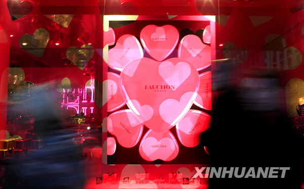 2月13日,行人走過法國巴黎街頭用心型圖案裝飾櫥窗的一家巧克力店。隨著情人節的臨近,在素有浪漫之都之稱的法國巴黎街頭,商家紛紛推出各種商品,吸引過往情侶與行人駐足。