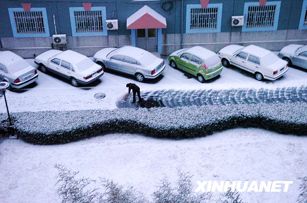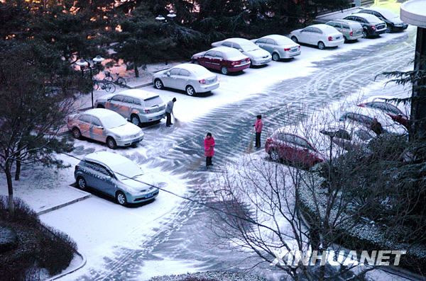 2月17日晨,在北京石景山區一居民小區內,居民在打掃小區道路上的積雪。當日,北京喜降春雪,市區一片銀白景象。