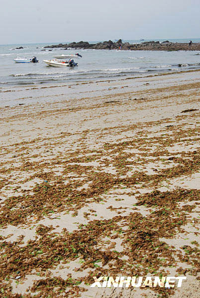 2月17日,工作人員清理后的海灘不多時又覆蓋上了一層海藻。連日來,北海市受東南風影響,部分海灘出現大量海藻,其中市區西部的冠頭嶺腳下情況最為嚴重,海灘被厚達數厘米的黃褐色海藻覆蓋,景區管理人員及時對此進行了清理。當地漁民稱,每年春天,都有這種俗稱“海木耳”的藻類被東南風刮到岸邊。