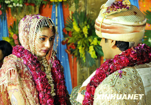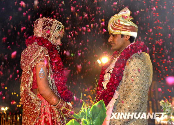 2月16日,在印度首都新德里郊外舉行的印度教婚禮儀式上,新娘深情地凝望新郎。印度青年男女的傳統婚禮儀式以其華麗的服飾、盛大的場面、熱情的歌舞等特色聞名。