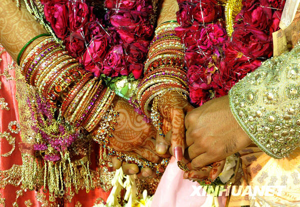 2月16日,在印度首都新德里郊外舉行的印度教婚禮儀式上,新郎新娘十指相扣。