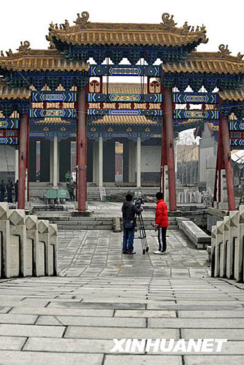2月19日,兩位記者在濟南府學文廟屏樓前拍攝。