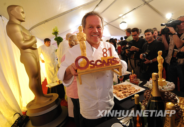 2月19日,在美國加利福尼亞州好萊塢柯達劇場外的紅地毯上,負責奧斯卡州長舞會食品供應的主廚沃爾夫岡·普克向媒體展示有小金人裝飾的糕點。當日,即將服務22日晚奧斯卡州長舞會的食品與裝飾正式向媒體亮相。新華社/法新