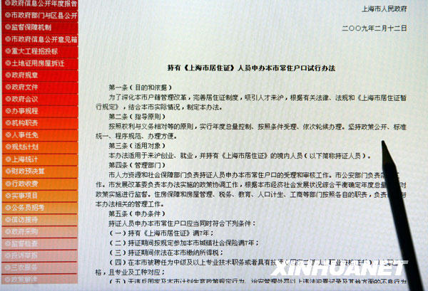 上海政府網站上發布的“戶籍新政”(2月23日攝)。