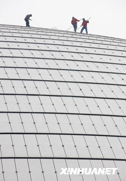 2月23日,工人在國家大劇院頂部進行清潔工作。當日,國家大劇院進行例行清潔工作,清潔要持續5天左右。