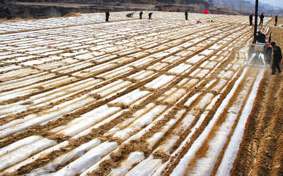 2月24日,甘肅省永靖縣農機服務隊在陳井鎮仁和村幫助農民覆膜保墑。連日來,面對持續的旱情,甘肅省各地農業、水利等部門技術人員深入田間地頭,幫助農民搶墑播種,抗旱保春耕。