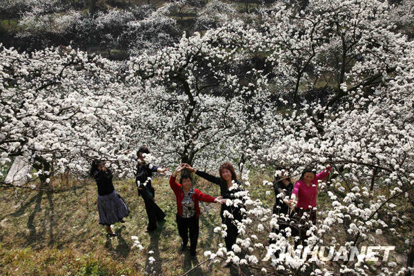 貴定縣盤江鎮中落海村的萬畝李樹鮮花盛開,游人在樹林間翩翩起舞(2月24日攝)。