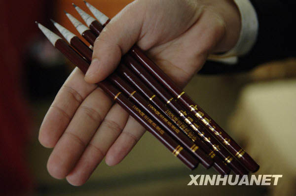 這是在安徽代表團駐地拍攝的用廢舊報紙制造的環保鉛筆(3月4日攝)。十一屆全國人大二次會議各代表團駐地紛紛采用環保鉛筆。