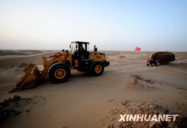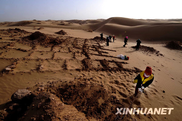工人在黃河岸邊的劉拐沙頭用粘土壓沙障(3月4日攝)。2009年春天,內蒙古自治區磴口縣啟動黃河岸邊劉拐沙頭綜合治理工程,計劃用3-5年的時間在劉拐沙頭建成一條大型沙漠鎖邊林帶,阻止烏蘭布和沙漠的流沙大量侵入黃河。該工程今年將投資625萬元,初步治理沙漠面積5萬畝。