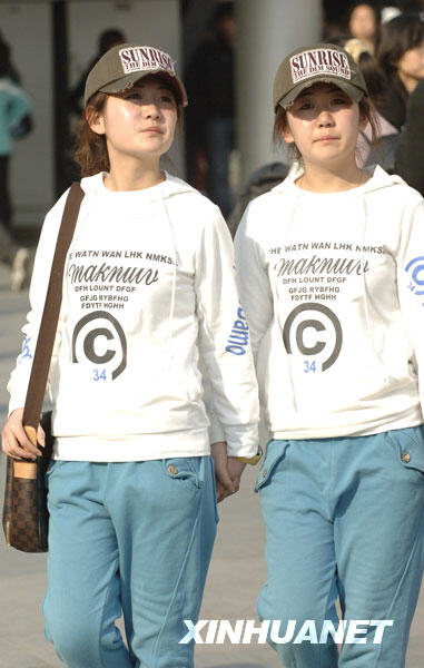 3月8日,北京一對著裝輕便的雙胞胎姐妹在逛街。當日,北京天氣晴朗,最高氣溫14攝氏度,讓人感受到濃濃的春意。