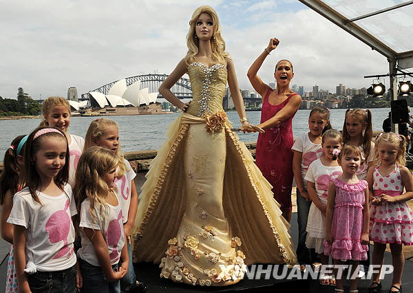 3月9日,在澳大利亞悉尼,模特埃麗卡·海娜茨準備切下高達2.1米的“芭比娃娃”巧克力蛋糕,以慶祝芭比娃娃50歲生日。當日,玩具芭比娃娃迎來50歲生日。芭比娃娃是美國人——美泰玩具公司創辦人露絲·漢德勒于1959年設計創造的,以其女兒芭芭拉的昵稱命名。新華社/法新