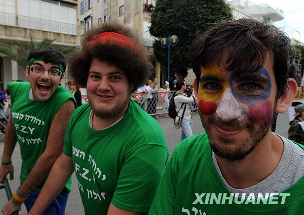 3月10日,在以色列中部小鎮霍隆,三名年輕人參加普林節游行。今年的3月10日至11日是猶太教傳統節日普林節。在普林節期間,猶太人身著夸張的服飾、戴著假面具參加狂歡游行,因此普林節又被稱為以色列的狂歡節。
