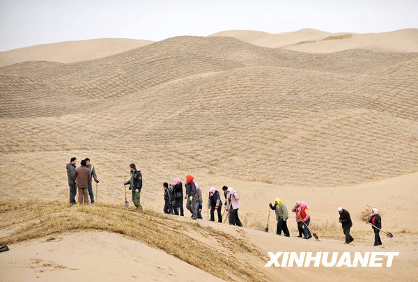 3月12日,寧夏靈武市白芨灘林場職工在毛烏素沙漠邊緣扎草方格。被騰格里、毛烏素、烏蘭布和三大沙漠包圍的寧夏回族自治區長年干旱少雨,是我國土地沙漠化最嚴重的地區之一。近年來,自治區不斷加大治沙力度,在沙漠邊緣大面積扎草方格固沙植樹,在沙塵源頭筑成一道“草長城”。目前全區已累計治理沙化土地47萬公頃,沙化土地面積由建國初的165萬公頃減少到目前的118.3萬公頃,在全國率先實現荒漠化逆轉。