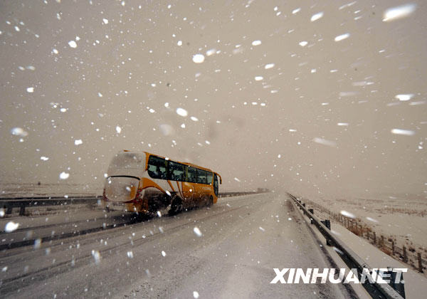 3月12日,一輛客車冒雪行駛在甘肅省張掖市山丹縣境內。從3月11日起,甘肅河西走廊的武威、金昌、張掖等地部分地區喜降春雪,有利于緩解旱情、春播生產。