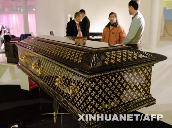 3月13日,觀眾在意大利維琴察舉行的奢侈品展上參觀一副價值近20萬歐元的豪華棺木。新華社/法新