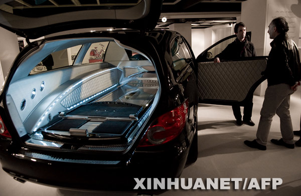 3月13日,觀眾在意大利維琴察舉行的奢侈品展上參觀一輛由奔馳R級旅行車改裝成的豪華靈車。新華社/法新