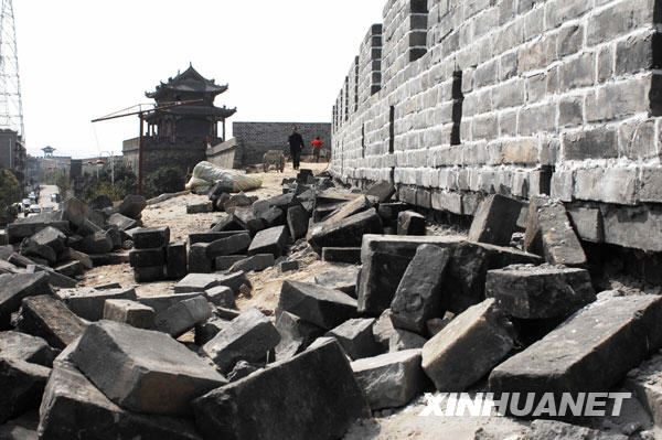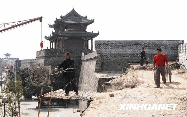 3月15日拍攝的襄陽古城墻修復施工現場。經國家文物局批準,湖北襄樊市對國家重點文物保護單位襄陽古城墻小北門至荊州古治段的447.2米的古城墻進行維修。維修工程主要包括對坍塌墻體和豁口處進行恢復、內外墻護坡加固、恢復垛堞、鋪設游路等。
