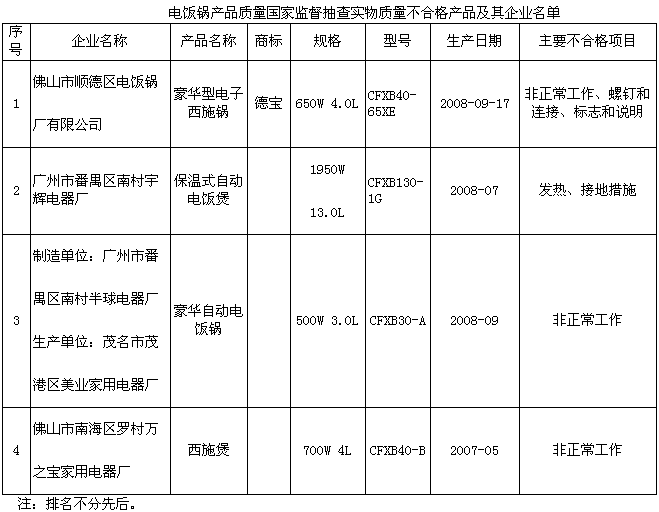 電飯鍋:抽查了廣東、浙江、上海、江蘇4個省、直轄市39家企業生產的40種產品,產品實物質量合格率為90%。這次抽查,重點對觸及帶電部件的防護、非正常工作、發熱等16個安全指標和2個電磁兼容指標進行了檢驗。抽查中發現的主要質量問題是非正常工作和發熱不合格。